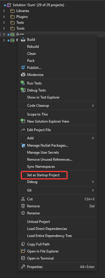 1. Right-click on the **Gum** project (not the solution)