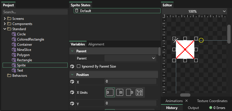 Sprite element is selected in the image above. Notice that since a **SourceFile** is not set, the Sprite renders as a red X.