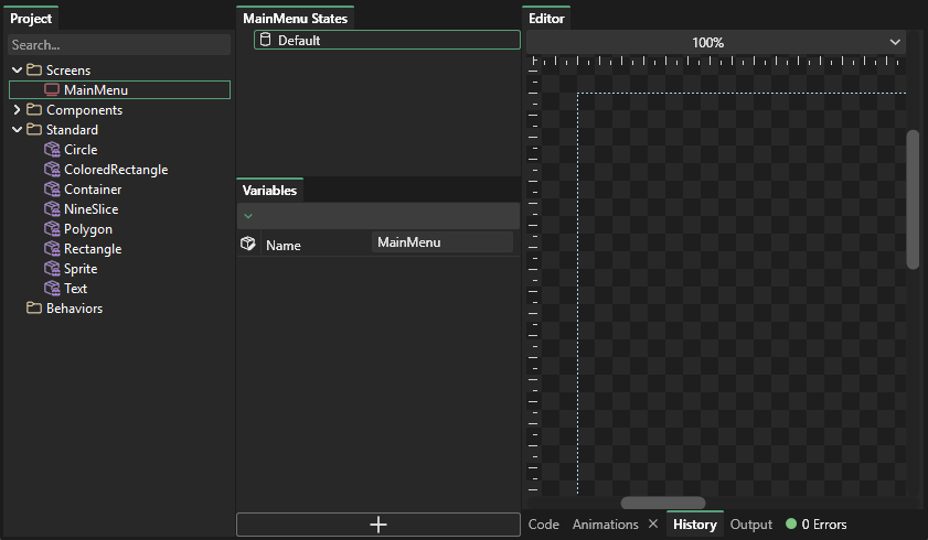 <figure><img src="https://2695663588-files.gitbook.io/~/files/v0/b/gitbook-x-prod.appspot.com/o/spaces%2F-M_fzQmxQ1VeUFHcoo2c%2Fuploads%2FyHVjVSUYzzXqRTYTcHDZ%2F23_04%2041%2054.gif?alt=media&#x26;token=1b6cf7b0-ad59-49bb-a975-53cc982570ac" alt=""><figcaption><p>Adding a Text instance to the MainMenu screen in the Editor tab</p></figcaption></figure>