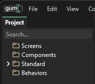 Gum separates its elements into three categories: Screens, Components, and Standard. Behaviors are an advanced topic that we'll skip for these tutorials.