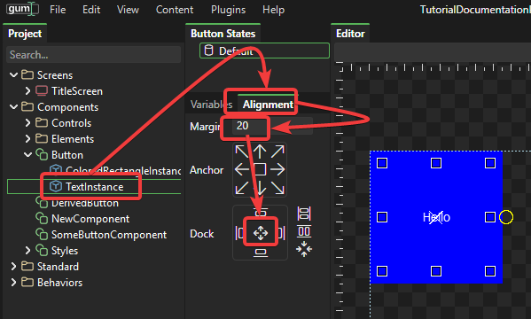 Next we'll position the TextInstance. We'll want to adjust the Text so that it is always centered, and line-wraps with the size of the button.